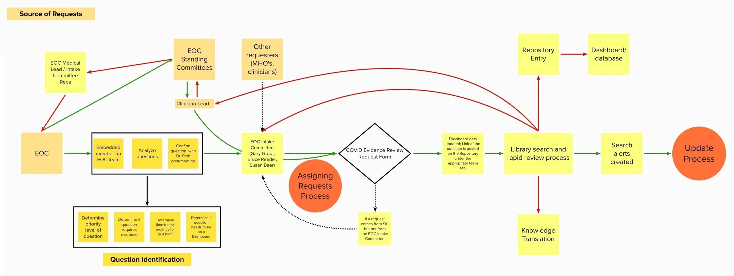 The CEST partnership was built around the Saskatchewan Health Authority’s questions about COVID-19. To answer those questions, the most up-to-date literature on the coronavirus was reviewed by expert teams which generated two key data types: Evidence Search Reports (ESR) and Rapid Review Reports (RRR). An electronic dashboard, database, and a repository were created to house Evidence Support Reports, Rapid Review Reports, as well as the current status of question. The repository and database created a common platform for clinicians, academics, leaders, and policymakers to find COVID-19 evidence which encompassed a wide range of topics– Long-Term Care, Clinical Departments, Public Health and Prevention, Therapeutics, Infectious Diseases, Health Care Policy, Vulnerable Populations, and Indigenous Peoples.
